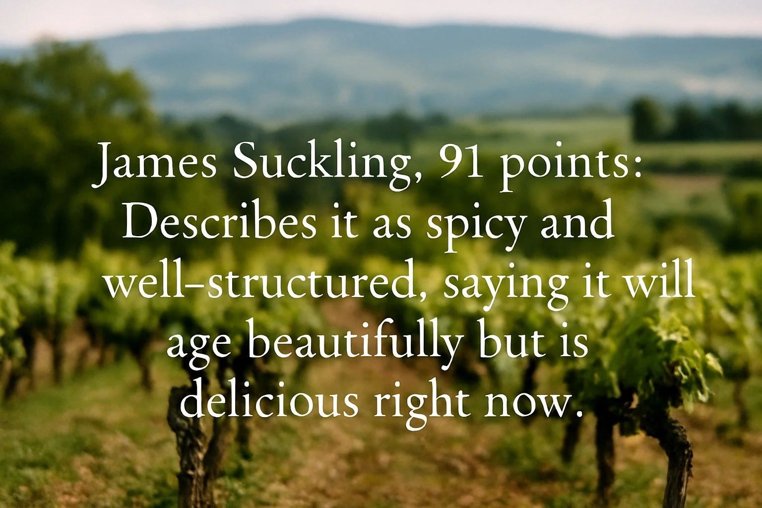 James Suckling, 91 points: Describes it as spicy and well-structured, saying it will age beautifully but is delicious right now.