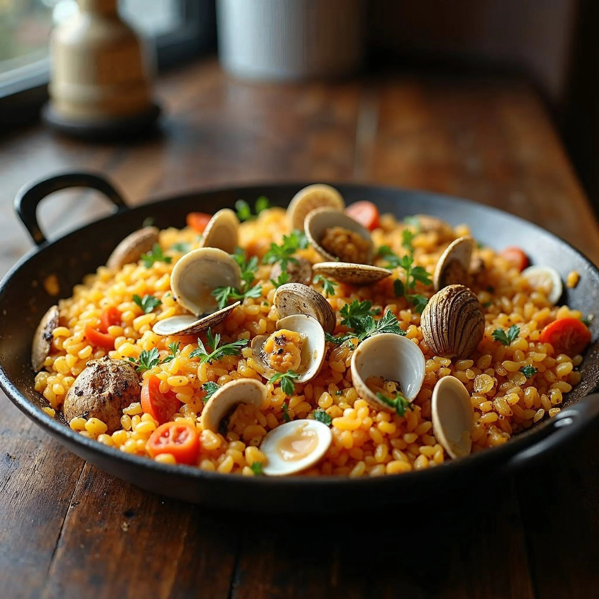 Our Spanish Paella during Apéro Hour this week—saffron rice, shrimp, chicken, chorizo, and vegetables